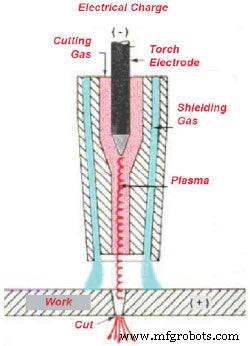 Obor plasma berisi saluran untuk memotong gas, yang diisi dengan elektroda obor. Menggabungkan keduanya menghasilkan formasi plasma terionisasi, yang membentuk sinar terfokus setelah melewati bukaan yang menyempit. Nosel ini juga meningkatkan tekanan dan kecepatan plasma yang melewatinya.